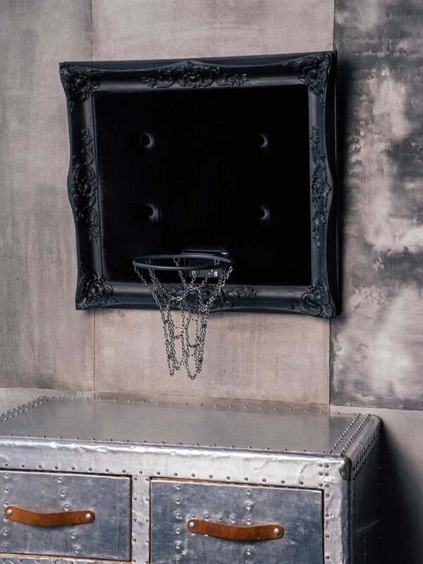 The Black & Gold Collection: As seen in NBC and USA Today, GimmeHoop boasts an impressive customer list from everyone from NBA teams to Shaquille O’Neal and some of the biggest CEOs in the world who have purchased their highly sought after framed hoops. Make your home or office walls really pop with this unique and elite piece of art. Choose from 4 different sizes up to 5 ft. wide. Our exclusive Black & Black collection is framed in a gold oversized baroque style frame with a Black velvet backing carefully pieced together with the finest care and handling. Our collections are all hand designed and crafted with elegant care and built to give the ultimate sport the royal treatment.