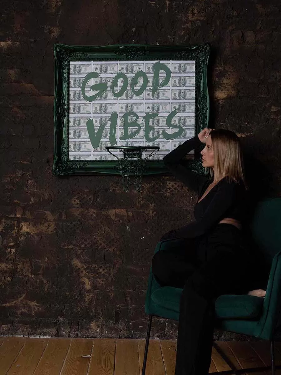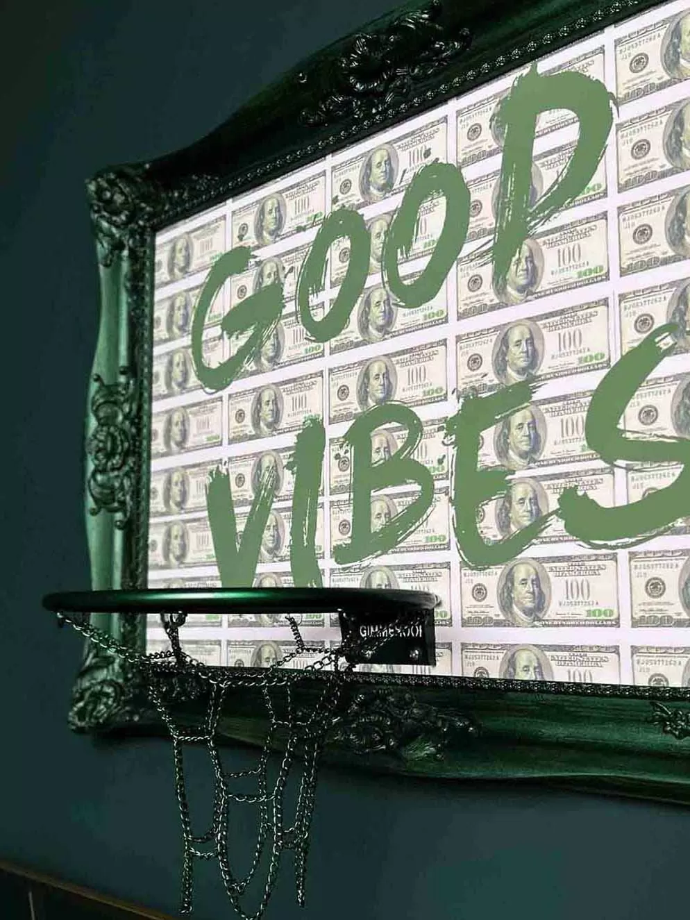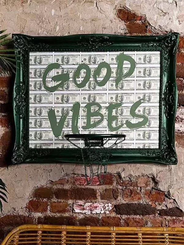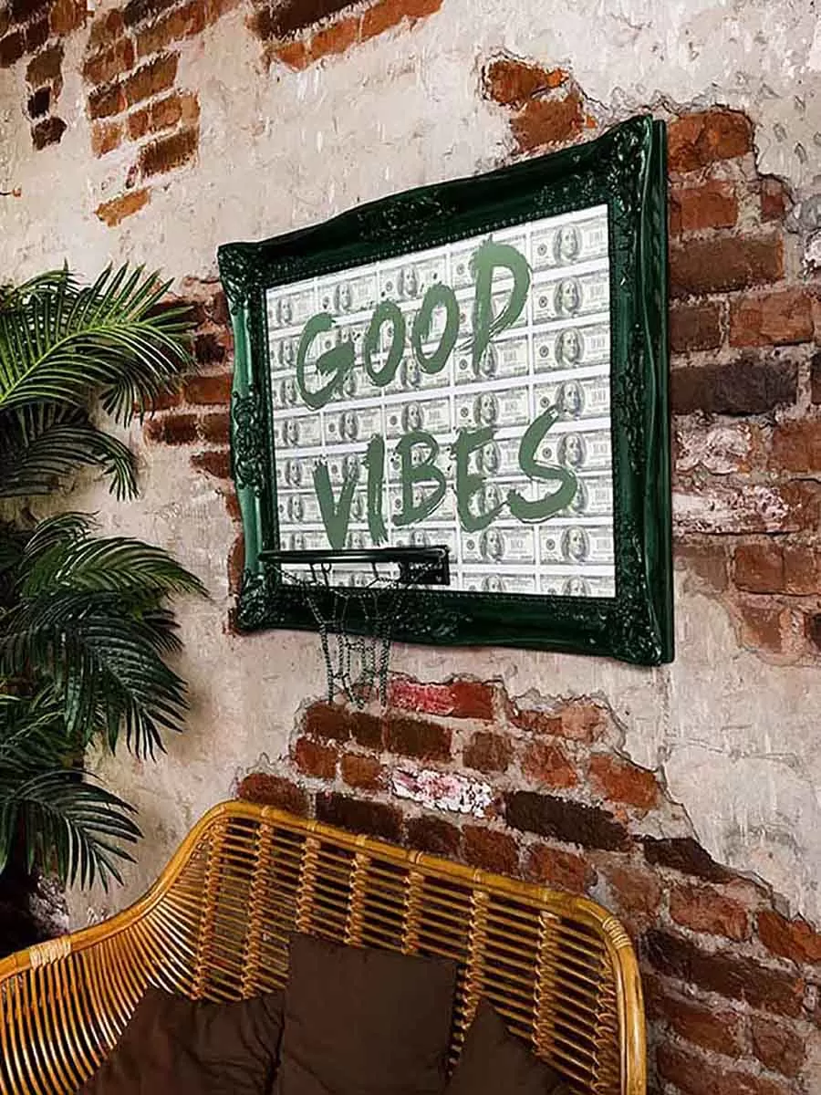 Our Good Vibes Hoop is a crowd favorite and is sure to make any space POP. Green baroque style frame and a canvas backing make for the perfect design that our customers love. Limited Edition.