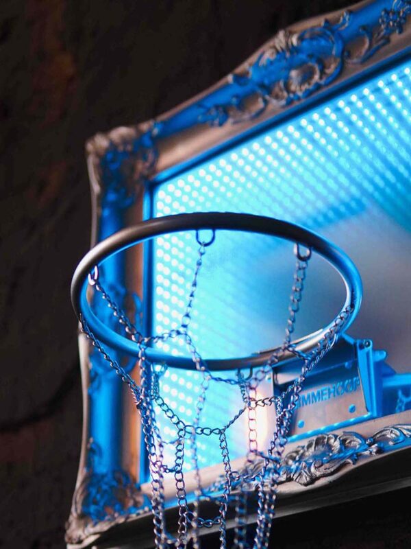 The Silver Infinity Collection: As seen in NBC and USA Today, GimmeHoop boasts an impressive customer list from everyone from NBA teams to Shaquille O’Neal and some of the biggest CEOs in the world who have purchased their highly sought after framed hoops. Make your home or office walls really pop with this unique and elite piece of art. Choose from 4 different sizes up to 5 ft. wide. Our exclusive Gold Infinity Collection is framed in an oversized silver baroque style frame with a LED mirrored backing carefully pieced together with the finest care and handling. Our collections are all hand designed and crafted with elegant care and built to give the ultimate sport the royal treatment.