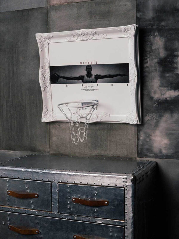 The Jordan Collection: As seen in NBC and USA Today, GimmeHoop boasts an impressive customer list from everyone from NBA teams to Shaquille O’Neal and some of the biggest CEOs in the world who have purchased their highly sought after framed hoops. Make your home or office walls really pop with this unique and elite piece of art. Choose from 4 different sizes up to 5 ft. wide. Our exclusive Jordan collection is framed in a white oversized baroque style frame with a canvas print backing carefully pieced together with the finest care and handling. Our collections are all hand designed and crafted with elegant care and built to give the ultimate sport the royal treatment.