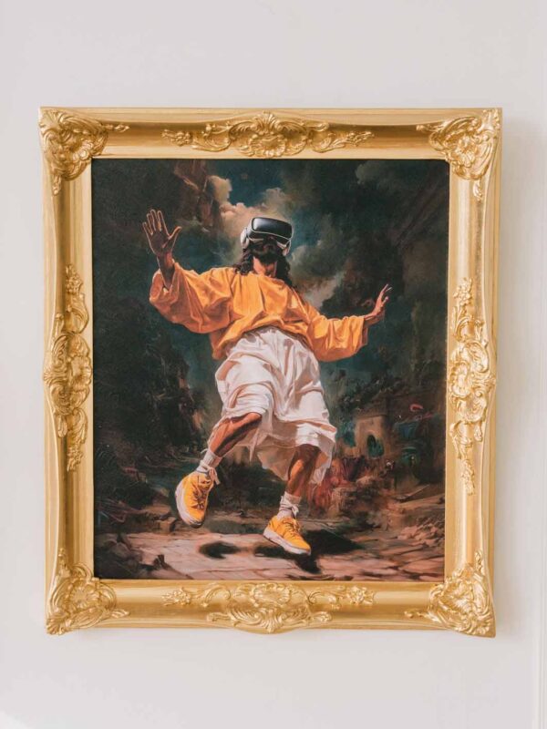 An ancient prophet hovering in the air with a VR headset on his face. It’s as if he’s suspended between worlds: reality and simulation, the past and the future. Around him are the ruins of an old world, while he’s already there, in a digital paradise. Yellow sneakers firmly anchor him in the present, but the question remains: are you still here, or are you already in the game?